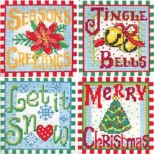 Herrschners , Herrschners Exclusive! Set of 4. Spread gleeful holiday sentiments with counted cross-stitch coasters. Fun-to-make kit includes 14-mesh plastic canvas, cotton floss, and easy-to-follow instructions. Approximately 4-1/4 x 4-1/4" (10.8 x 10.8cm). Made in U.S.A., thread imported from France.