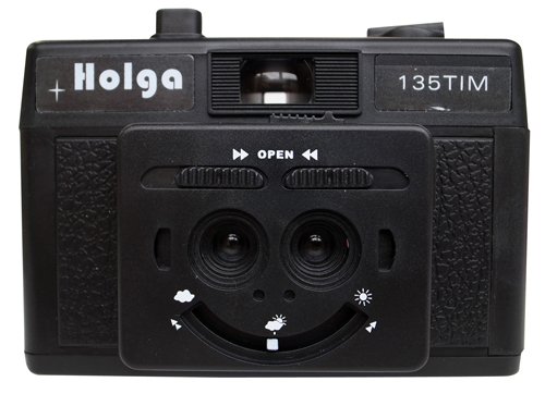 Holga 135 TIM, If you want a half-frame 35mm camera with a hot-shoe and dedicated flash, that can make multiple exposures, is loaded with artistic street cred and has a really, really cute face on the front of a camera body that's the color of a lollipop, who you gonna call? The answer is Holga-Holga 135 TIM 35mm 1/2 Frame Twin/Multi-Image Camera (BLACK). The 135 TIM is even smaller than a normal Holga 135, with no protruding lens. It has two inset lenses and each lens has its own cover-the eyes of the face on the camera. Open one, press the shutter release, use the MX button to re-cock the shutter, close the first eye and open the second eye, shoot again and advance the film. Or you can open both eyes at one time and shoot both sides of the frame simultaneously, or keep re-cocking the shutter to multiple expose your film as many times as you want to. There's a button to switch between normal shutter (1/100s) and bulb setting, an adjustable aperture (f8, f11 and f22) and the afore-mentioned hot-shoe for the optional (color coordinated) Holga 12S flash with color filters.